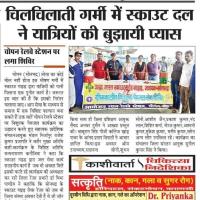 निःस्वार्थ भाव से निःशुल्क प्याऊ सेवा शिविर का किया आयोजन हुआ यह शिविर 1 महीने का आयोजित हुआ जिसमें स्काउट गाइड वालंटियर एवं पदाधिकारी गण कड़कती धूप में चोपन सोनभद्र में स्थित रेलवे स्टेशन पर विगत वर्षों की भांति आयोजित कराया गया जिससे पत्ते हर्षोल्लास के साथ संपूर्ण परिचय बालक इस सेवा शिविर का आयोजन को सफल बताएं और मानव सेवा ही ईश्वर सेवा है इसी के साथ साथ लोगों के आशीर्वाद को प्राप्त किया जो दूर दूर से यात्रीगण सफर कर रहे थे गर्मी कड़कती धूप में एक बूंद पानी के लिए तरस रहे लोगों को पेट भर पानी पिलाकर अपार हृदय को संतुष्ट प्रदान कराई यह देख कर सभी यात्रीगण बहुत ही साधुवाद सांत्वना आशीर्वाद प्रदान कराएं