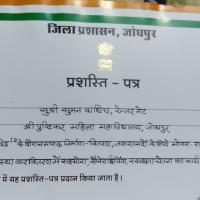 जोधपुर जिला कलेक्टर श्रीमान प्रकाश जी राजपुरोहित द्वारा कोविड़ 19में उल्लेखनीय सेवाएं देने हेतु प्रशस्ति पत्र प्रदान करके सम्मानित किया जोधपुर राजस्थान।