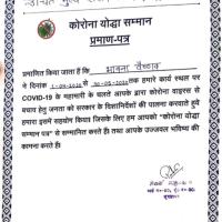 कोरोना योद्धा के रूप में अपने स्थानीय क्षेत्र तथा अन्य क्षेत्रों में मास्क वितरण तथा अन्य जन जागरूकता पूर्ण कार्य किए , इन कार्यों के प्रति क्षेत्र वासियों ने आभार प्रकट करने तथा प्रेरित करने हेतु कोरोना योद्धा के रूप में प्रशस्ति पत्र एवं माल्यार्पण किया और साथ ही राशन वितरण केंद्र और केनरा बैंक द्वारा भी प्रमाण पत्र प्रदान करके प्रेरित किया