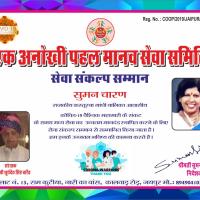 कोविड -19 वैश्विक महामारी के यूनिट लीडर सुमन चारण द्वारा किये गए कार्यो हेतु मानव सेवा समिति द्वारा संरक्षक पदम् श्री सूर्यदेव सिंह बारठ व निदेशक सुमन सिंह द्वारा सेवा संकल्प पत्र से सम्मानित किया गया