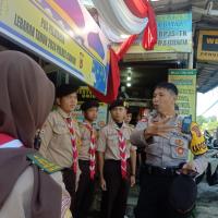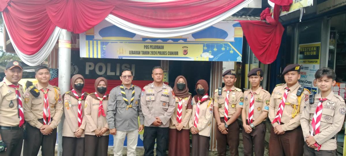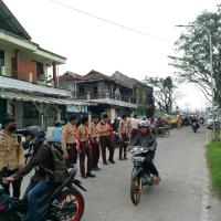 Anggota pramuka membantu mengatur lalu lintas dan membantu penyeberang jalan.