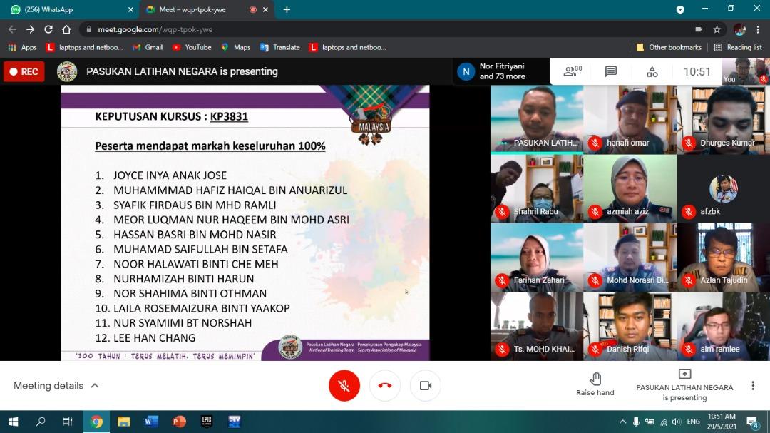 This program is handled online for a week using the National Training Team website and Google Meet. The scouts need to read all of the slides and answer the quiz. The passing percentage for this course is 80% and during the last day, we need to attend the open session with the trainers and assistance trainers.