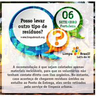 Principais Agentes: Marcos Clayton Fernandes Pessoa - Registro Escoteiro Número: 855780-2 Maria Victória Alves de Mesquita Pessoa - Registro Escoteiro Número: 854588-0 LUCINEIDE MARQUES FERNANDES - Registro Escoteiro Número: 894314-1 A sustentabilidade muito importante. Limpa Brasil é um movimento de cidadania que envolve escolas e comunidades com objetivo de conscientização em relação ao descarte correto de recicláveis. No dia 06 de setembro (sábado) toda a população fortalezense está convidada a participar do movimento e a ajudar a promover uma mudança de atitude em relação à reciclagem. Antes do evento é importante divulgar as ações e locais de entrega. Colocar o tema nos avatares do Twitter e Facebook e divulgar a campanha também é importante. Nosso trabalho foi divulgar a ação em escolas e condomínios. Estaremos catalogando a quantidade de material a ser levado e temos mais de 150 kilos de material reciclado que será entregue nas Lojas Pão de Açúcar especialmente a loja Fátima (Rua Dr. Costa de Araújo, 1132) Para participar da ação é simples: basta levar o material reciclável já higienizado a um dos 27 pontos de coleta do projeto espalhados pela cidade e em 09 lojas da rede Pão de Açúcar em Fortaleza ou retirar num destes pontos um kit contendo um saco de 100 litros e luvas para coletar o material reciclável que estiver descartado incorretamente, na região da cidade que preferir. Todo o material reciclável recolhido será entregue na sede da Cooperativa de Catadores de Materiais Recicláveis de Fortaleza e Região Metropolitana, que agrega 17 associações e aproximadamente 300 famílias. Fizemos até algumas atividades utilizando garrafas PET para criar aviões de sucata e outros brinquedos. Na reunião de 6 de Setembro a Alcatéia do 5o. Grupo Escoteiro do Ar Pinto Martins fez a limpeza da Praça Verde do Dragão do Mar e o material deixado diretamente no Parque do Cocó. #limpabrasil #muteco2015 #mensageirosdapaz. O 5o. GREAPIM vem executando vários projetos dos Mensageiros da Paz Mensageiros da Paz. Um deles é o http://scout.org/node/39800 - Limpa Brasil - Let´s do it. Realizamos no sábado 13 de Junho a limpeza da Praça da Igreja de Fátima onde estamos nos reunindo. Focamos na limpeza da praça e especial a questão das bitucas de cigarro. As bitucas de cigarro são especialmente prejudiciais ao meio ambiente. Em 23 de Maio participamos do scout trash day trash - http://scout.org/node/65981 - Dia Escoteiro de recolher o Lixo. https://www.facebook.com/scoutstrashday?fref=ts scouts Que venha a atividade principal do Limpa Brasil. We will do it with "Limpa Brasil" http://www.limpabrasil.net/ A atividade faz parte também do MUTECO e colabora para a conquista da Insignia Mundial do Meio Ambiente. RAE - Rede Ambiental Escoteira Avisamos a todos que ainda em parceria com o LIMPA BRASIl e RECICLE e dentro do MUTECO estamos fazendo uma grande campanha de arrecadação de reciclados com o objetivo de melhoria do meio ambiente. AÇÃO EM 2015 19 DE SETEMBRO DE 2015 Foi muito bom mais um ano poder colaborar com o LImpa Brasil. O 5o. Grupo Escoteiro do AR PInto Martins levou mais de 40 sacos de material reciclado para os locais nas praias do Futuro e em Aracati. Colaborou com a limpeza das praias e ainda se divertiu com o show. Excelente parceria. ações de limpeza e conscientização no mês de setembro. Em busca da criação da consciência e do hábito em toda a população, o Limpa Brasil realiza, junto ao projeto Limpando o Mundo, mais uma vez uma ação de limpeza de praia, atividades lúdicas e apresentação musical, hoje pela manhã (19), em Fortaleza, na barraca Cuca Legal, na Praia do Futuro. A coleta de lixo na praia, entre materiais orgânicos e não orgânicos, deve seguir até a barraca Terra do Sol. A coleta de lixo na praia, entre materiais orgânicos e não orgânicos, deve seguir até a barraca Terra do Sol. Já amanhã (20), as praias de Aracati, Canoa Quebrada, Quixaba e Majorlândia receberão um mutirão promovido pelo Bom Vizinho Shopping, da Rede Pinheiro Supermercado, com a ONG Limpando o Mundo, a partir das 8 horas. Praia do Futuro Serão aproximadamente 2,5 Km de areias mais limpas com a ação, que tem um propósito não apenas ambiental, mas também educativo, uma vez que objetiva chamar atenção para a necessidade imediata de praias mais limpas e manutenção desses ecossistemas. Qualquer pessoa interessada em colaborar com a causa pode participar da iniciativa. São disponibilizados sacos de lixo, luvas, protetor solar e álcool gel para o processo de coleta. Após a coleta na praia são realizadas atividades lúdicas e apresentação musical com as bandas Pukabanda e DanDan – O dom da pegada. O projeto conta com a cooperação da Organização das Nações Unidas para a Educação, a Ciência e a Cultura (Unesco) no Brasil, Ministério da Educação (MEC), apoio do Ministério do Meio Ambiente (MMA) e das prefeituras municipais, e pretende incentivar a reflexão para a mudança de atitude do cidadão brasileiro em relação ao hábito de jogar lixo fora do lixo. Com várias ações programadas já para setembro, o projeto segue até dezembro repleto de atividades, shows e palestras. Em Fortaleza, o projeto conta com o patrocínio local da Prefeitura Municipal de Fortaleza e da C. Rolim Engenharia, Nacional Gás, Esmaltec, Hipercor, Indaiá, Hotel Sonata de Iracema, Faculdade CDL, Sindigráfica, Beach Park, Universidade de Fortaleza (Unifor), e apoio do Roratact. Conta ainda com o apoio Nacional da Unesco, MMA, TV Globo, Awaken Love e União dos Escoteiros do Brasil. 20 DE SETEMBRO DE 2015 Praias de Aracati Para ampliar o grau de conscientização das pessoas sobre a importância de preservar as praias, o Bom Vizinho Shopping promove junto com o Projeto Limpando o Mundo, um mutirão de limpeza nas praias de Canoa Quebrada, Quixaba e Marjolândia, durante toda a manhã de amanhã (20). O encontro acontecerá