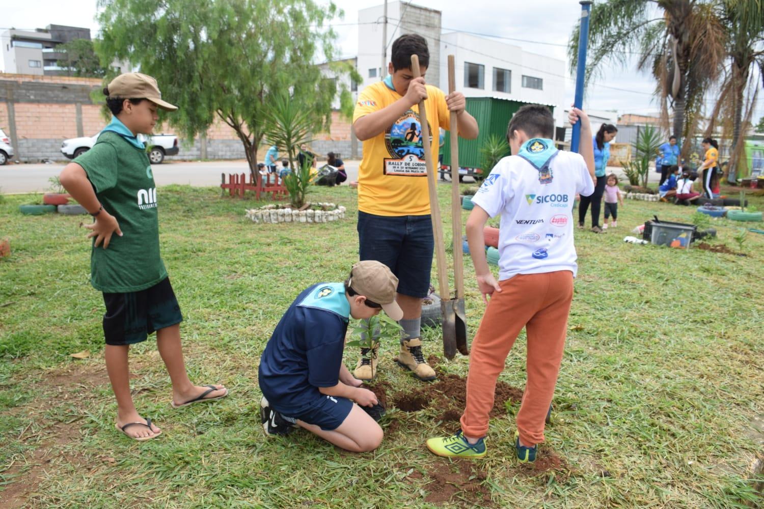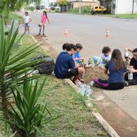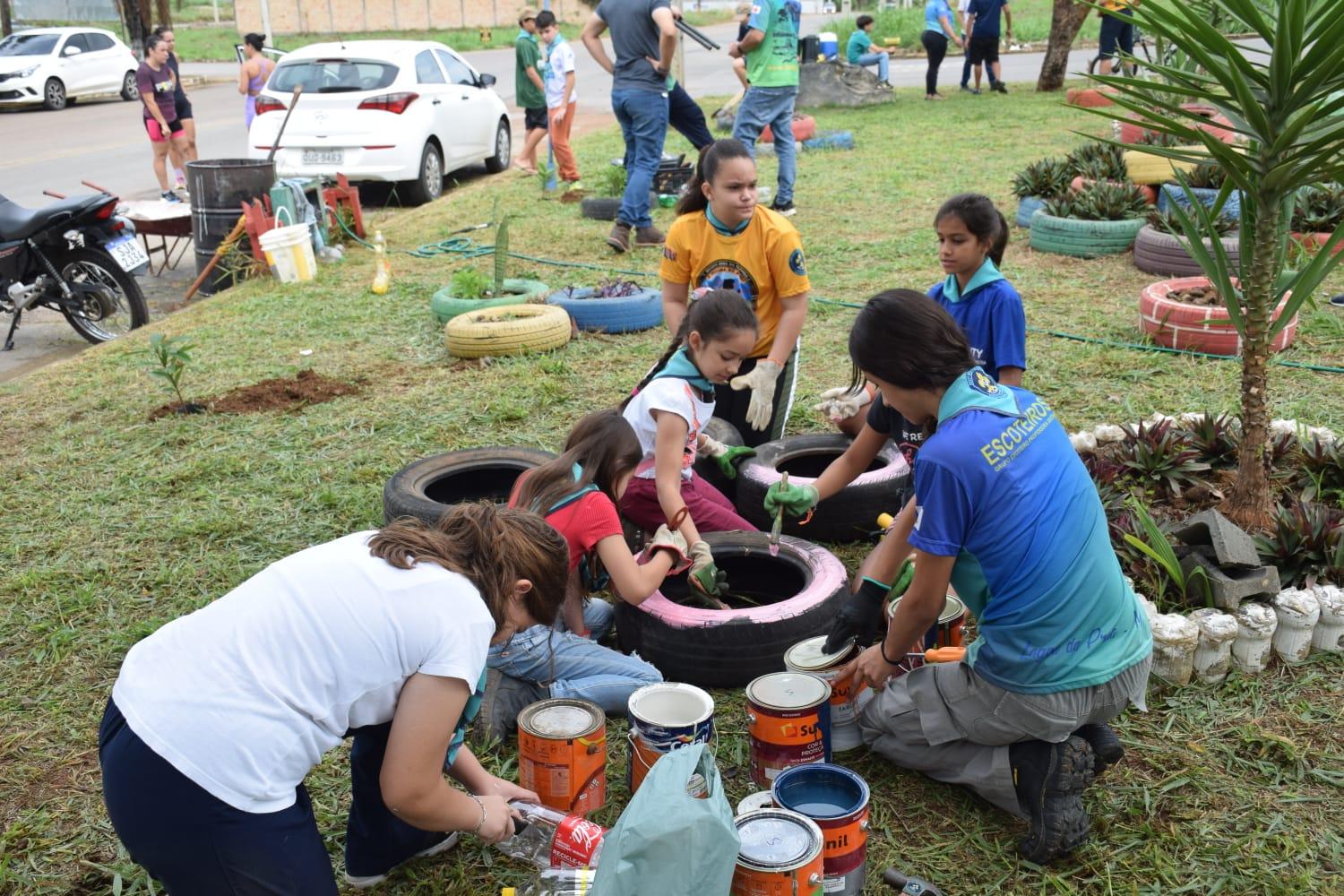 As tarefas foram organizadas por meio de equipes formadas por escoteiros e lobinhos, de acordo com as habilidades de cada um. Isso incluiu a coleta do lixo, pintura dos canteiros, colocação do cal no meio-fio, entre outras atividades de revitalização. Utilizamos materiais recicláveis como garrafas PET, e elementos naturais, como plantas, para decorar a praça.