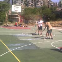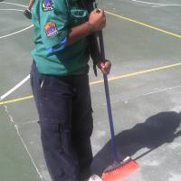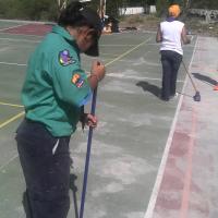 Miembros del Grupo Scout IV ayudaron en la limpieza de tierra, matorrales y piedras de una Cancha Multifuncional. Dentro de una escuela en una zona de escazos Recursos. Luego se pintaron arcos y piso.