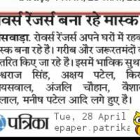 राजस्थान राज्य भारत स्काउट गाइड जिला मुख्यालय बांसवाड़ा सीओ स्काउट श्रीमान दीपेश जी शर्मा के नेतृत्व में हमारे द्वारा मास्क बनाए गए एवं उन्हें निशुल्क वितरित किए गए यह मास्क हमारे द्वारा बनाए गए थे एवं जिन्हें हमने हमारे आस पड़ोस एवं कच्ची बस्तियों में बांटे ताकि हर व्यक्ति सुरक्षित रह सके |