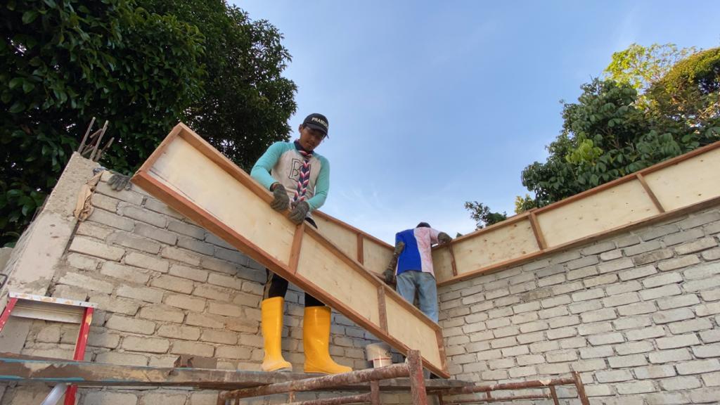 Setelah selesai tugas sebagai Ketua Pembinaan Projek, saya juga meneruskan kerja pembinaan dengan memasang kotak tiang dan mengisi konkrit (simen + pasir kasar + kuari halus) dan 4 besi batang besi y10 yang diikat dengan besi kolom dan dawai bagi memastikan tunjang tiang madrasah kuat dan tahan lama. Seterusnya, penggaulan konkrit (simen + pasir kasar) bagi pengikatan bata bagi membuat dinding madrasah. Saya juga membuat dan memasang kotak bing atas dan mengisi konkrit (simen + pasir kasar + kuari halus + 4 batang besi y10 diikat dengan besi kolom dan dawai) untuk memastikan kekuatan bing atas bagi menampung berat kerangka bumbung(besi).