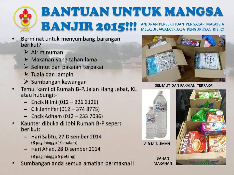 Every body know that Malaysia having abig flood in East Coast Area such ad Kelatan Terengganu and Pahang. All the state look like island during the flood. So all the scout in the related state involve in the rescue program with thw National Disaster Committee, Every state lead by their Chief Scout Commissioner, Hj Adnan (Kelanatan) Hj. Che Soh (Terengganu) Dato Lias (Pahang). For Northern of Peninsular Malaysia was lead by Kedah CSC (Hj. Ku Ismail) > At the same time Dato Awang was involve with the Sabah flood in Borneo. Other state which is not involve with flood comw out with support group to supply cloth, water, food and other material collaboration with police, army snd other NGOs.