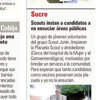 Reconociendo que el principal problema es la falta de conciencia respecto al cuidado del medio ambiente y el manejo de la basura departe de la población, el proyecto busca desarrollar una campaña de entronización ambiental partiendo de la idea de que todos somos responsables de cuidar nuestro entorno. Para lo que se desarrollaron actividades de limpieza para enseñar haciendo y con el ejemplo, y se difundirán mensajes de educación ambiental a través de diferentes medios utilizando las nuevas tecnologías de la información y comunicación en la ciudad , difundiendo de manera amplia la experiencia para motivar a que jóvenes de otros lugares y países también quieran desarrollar experiencias similares. La primera de organización, coordinación, diseño de materiales de difusión, en la que nos reunimos con representantes del barrio en el que se llevo a cabo el proyecto, con representantes de EMAS, que nos informaron que sus actividades son programadas anualmente, a inicio de cada año, por lo que solo coordinamos la recogida de basura (de la tercera fase que explicaremos mas adelante) nos prestaron material audiovisual de concientizacion, en base al cual produjimos el vídeo de la campaña del proyecto, y también nos informaron que ellos no regalaban volantes porque era mas producir mas basura, por lo que pedimos material a la alcaldía, y así se hizo el vídeo y se contaron con los materiales para la educación ambiental a la población. También trabajamos dentro de todas las ramas y unidades del grupo scout junin, para que usen material reciclado en los juegos que construyeron durante todas sus actividades y logramos que se concientizaran, y les ayudamos a hacer el cartel de recolección de botellas plásticas para el grupo. La segunda fase mas de concientizacion, una vez que teníamos el material de sensibilizarnos hicimos una coordinacion con la escuela taller sucre donde dimos la charla a jóvenes, también coordinamos con la casa de la cultura para dar la charla a niños, niñas y adolescentes, abordando diferentes temas como las causas del cambio climático, entre las que están la tala de arboles y el mal manejo de la basura. Finalmente coordinamos con los miembros que habían sido de la comunidad rover pendragon del grupo scout junin para hacer la limpieza en la plazuela scout, limpiamos las áreas verdes, los alrededores de la plazuela, sacamos las propagandas electorales del busto de Baden Powell y arreglamos la protección de las plantitas de los jardines, todo esto causo una buena respuesta de los vecinos que nos felicitaban comprometiéndose a cuidar el barrio mas, y EMAS nos ayudo recogiendo las bolsas de saquillos que llenamos con la basura recogida en el lugar. Y el periódico local cubrió la actividad con una nota en Correo del Sur . Difundimos los materiales tanto al interior del grupo como a la población, haciendo que tomen conciencia de la importancia de cuidar todos y todas nuestra ciudad y nuestros barrios, por el bien del medio ambiente.