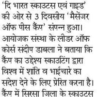 With the great inspiration of our National Co-Ordinater(MOP Program) Shri Krishnaswamy Ramamoorthy & State Training Commissioner Shri Laxmi Singh Verma, I organized a Messengers of Peace workshop from last 24 to 26 April, 2014. It was a a great opportunity for me as a trainer on this project. 85 members including Scouts, Rovers, Guides & Rangers from various schools, open groups & colleges had participated in this workshop. During this workshop training about the project given to all like how they can create their profile on www.scout.org & how to post their service projects. All faith prayer, Games, Youth Forum, Quiz Contest & Tree Plantation were also include in this workshop.