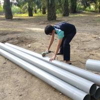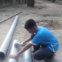 Setelah barang sampai ke tapak, kami memulakan kerja memotong paip Pvc yang panjangnya 19 kaki kepada 3 bahagian (6 kaki). Kegunaan paip Pvc adalah sebagai tiang kandang, didalam paip Pvc akan dimasukkan simen supaya menjadi kukuh.