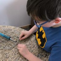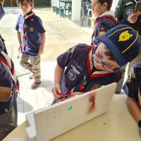 Usando ferramentas para eletricidade e eletrônica, uma caixa de isopor reciclada, fios, soldador e solda, montei um modelo reduzido e transportável para poder apresentar para a minha Alcateia.