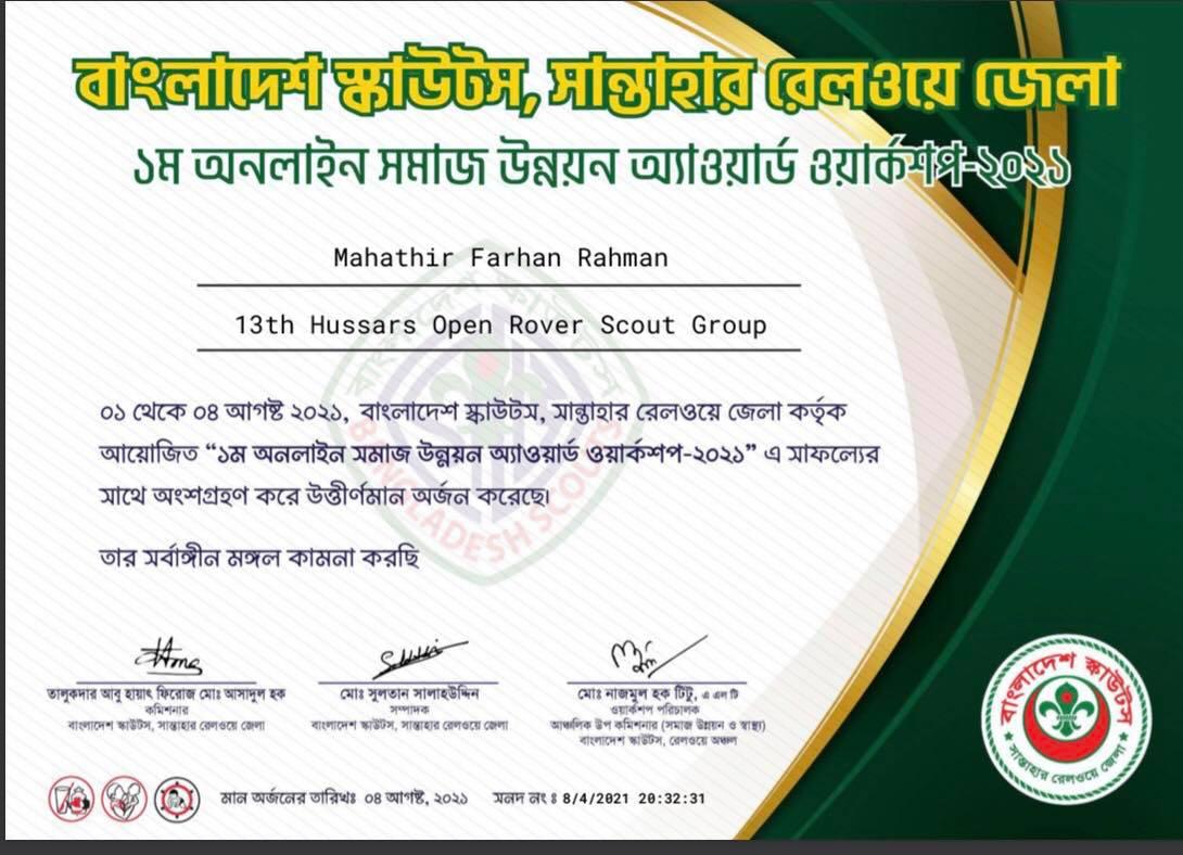 CD Award of Community Development Award is a major award in Scouting and Rovering. Bangladesh Scouts, Santahar Railway District Scouts Group organised a 4 day long virtual workshop that teaches scouts how to achieve the CD Award and necessary actions for it. The main inspiration behind my participation was the knowledge regarding CD Award and learing new types of activities.