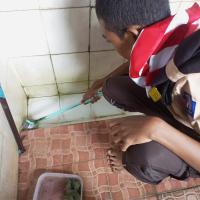 Kita berdua mulai membersihkan sekitar musholla. Dilanjutkan dengan membersihkan bagian dalam musholla, seperti tempat sholat, tempat wudhu dan lain sebagainya. Pada tempat sholat, kita membersihkan sajadah dengan vacum cleaner atau penyedot debu. Setelah itu, dilanjutkan membersihkan tempat wudhu dengan menyikat kotoran yang menempel pada saluran air dan diberi cairan pembersih kerak.