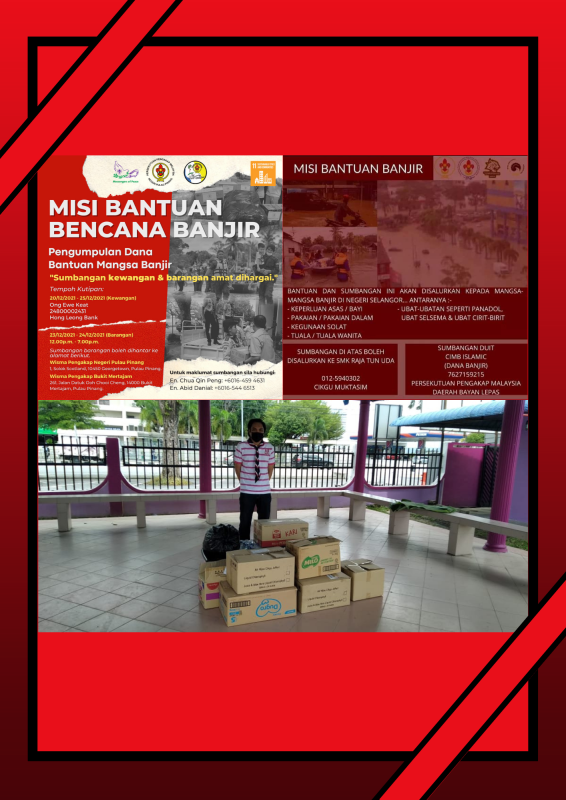 Sumbangan barangan diterima di Wisma Pengakap Negeri Pulau Pinang dan Wisma Pengakap Bukit Mertajam pada 23 Disember 2021 dan 24 Disember 2021 jam 1200 hingga 1900. Manakala sumbangan wang tunai diberi ke akaun bank Majlis Pengakap Negeri Pulau Pinang dari 20 Disember 2021 hingga 25 Disember 2021.