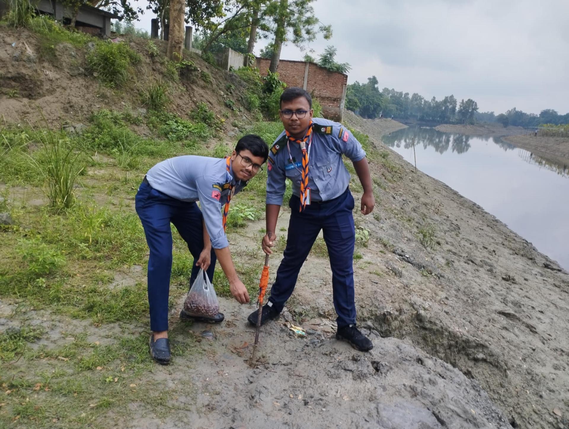 We 10 Rovers and Girl in Rovers from Bogura Polytechnic Institute Rover Scout Group planted 3-5 thousand date palm seeds in 2 days from 29th June 2024 to 30th June 2024 on both banks of the new version of Bogura Karatoa River covering an area of about 2 km. It is completely organized by Rajful Welfare Trust. We participate spontaneously in this work every day from 10:00 AM to 5:00 PM.