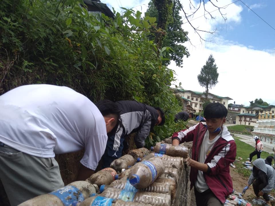 Used the plastic bottles filled with plastic wrappers and wastes to build wall. We collected the wastes from the community on weekly basis and carried out the construction work for almost 14 times to complete.