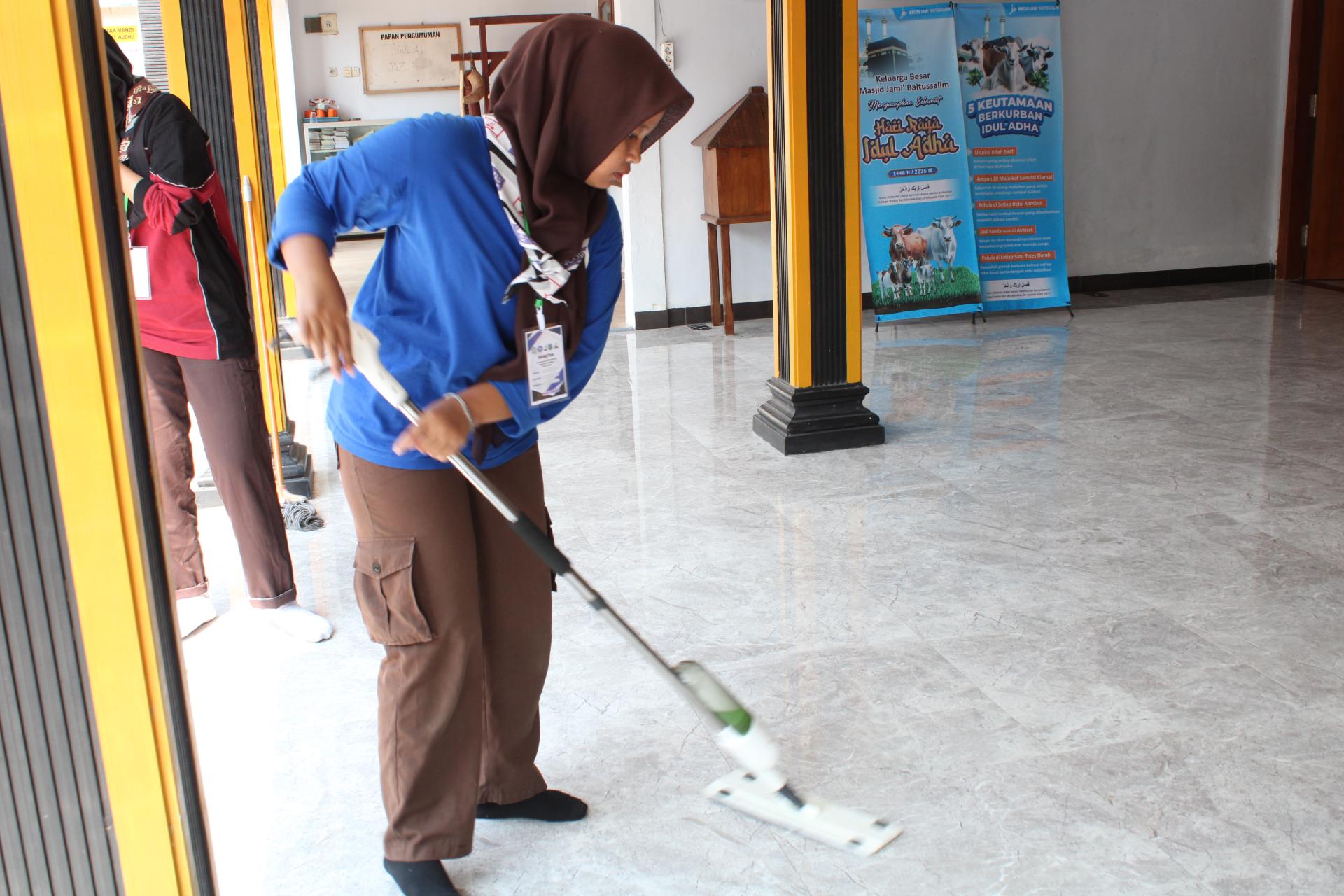 Kegiatan bersih-bersih mushola dilaksanakan pada tanggal 1 sampai 10 Juli 2025, setelah pelaksanaan kegiatan pemugaran rumah tidak layak huni. Adapun bentuk kegiatan meliputi pembersihan menyeluruh mushola seperti menyapu dan mengepel lantai, membersihkan tempat wudhu dan toilet, merapikan rak-rak Al-Qur'an, serta membersihkan langit-langit dan ventilasi guna menciptakan suasana yang lebih nyaman dan higiens untuk beribadah.
