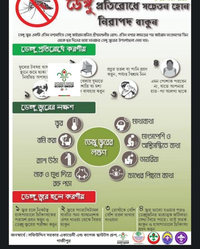 Now dengue is the most dangerous disease in our community. So the advices of our NSO scout organisation, we are doing the services in our community to prevent dengue fever. Symptoms, which usually begin four to six days after infection and last for up to 10 days, may include Sudden, high fever Severe headaches Pain behind the eyes Severe joint and muscle pain Fatigue Nausea Vomiting Skin rash, which appears two to five days after the onset of fever Mild bleeding