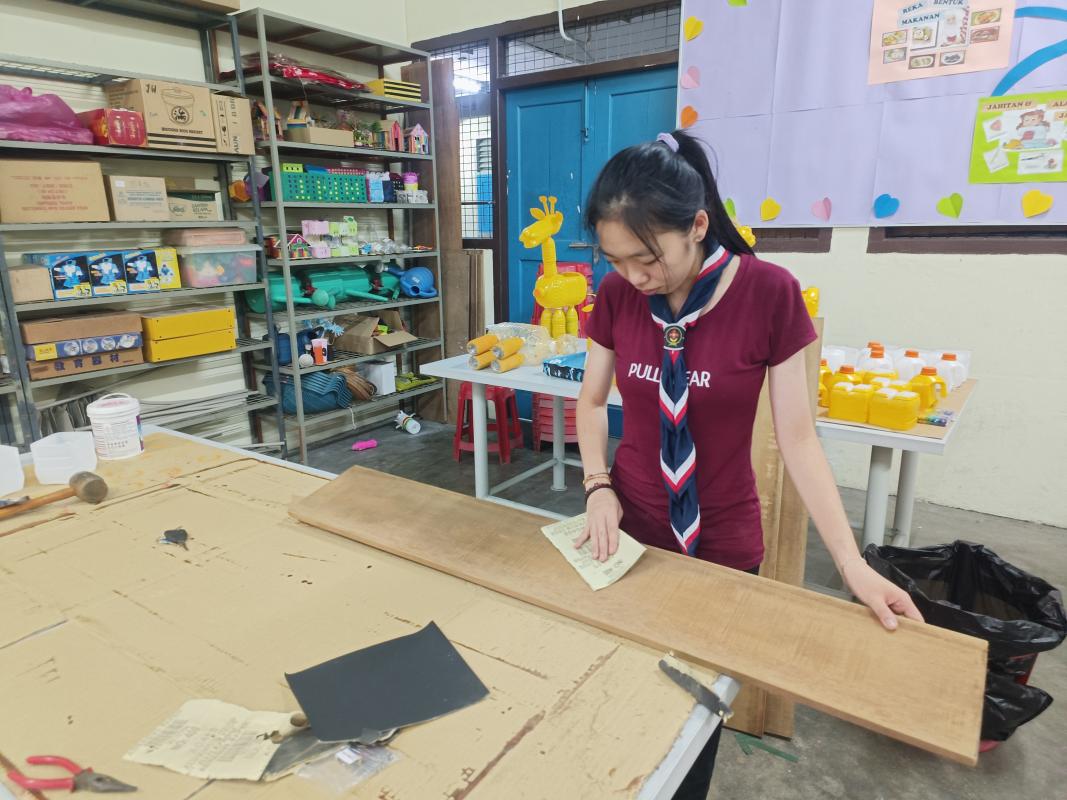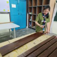 Selepas membeli bahan-bahan utama di kedai One Eight Hardware, kami memulakan kerja mengasah semua batang kayu dan papan kayu dengan menggunakan kertas pasir supaya permukaan kayu menjadi licin. Kemudian, kami mengelap permukaan kayu yang mempunyai habuk menggunakan kain kering. Seterusnya, kami menyapu syelek pada permukaan kayu sebanyak tiga lapisan. Setiap lapisan syelek yang disapu perlu dikeringkan sekurang-kurangnya enam jam terlebih dahulu barulah boleh menyapu lapisan seterusnya.
