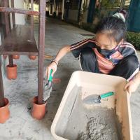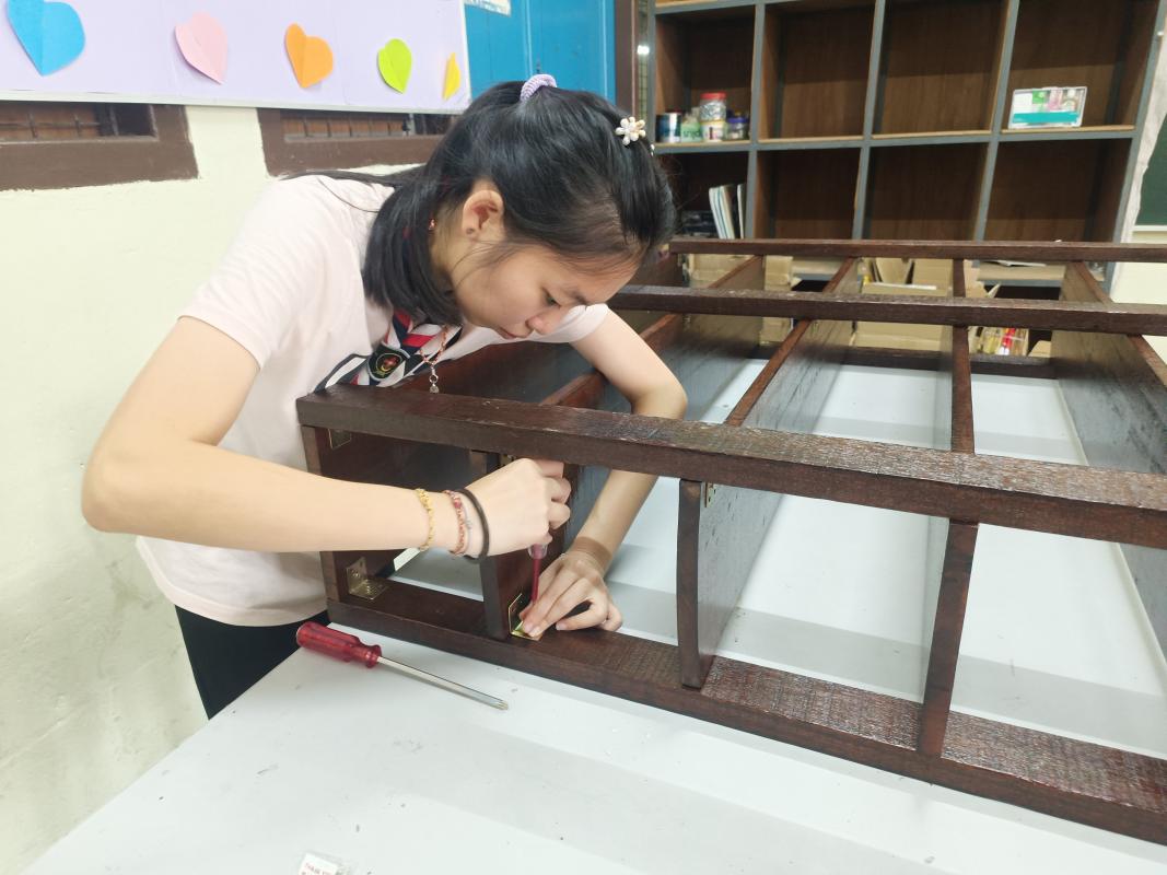 Setelah siap kerja mengasah dan menyapu syelek, kami memasang braket L keluli karat untuk mencantumkan kayu papan dan papan kayu. Seterusnya, kami memaku paku untuk mengetatkan cantuman papan kayu dengan batang kayu. Selepas itu, kami memotong botol plastik dan mengecat dengan warna coklat lalu memasukkan kaki kayu rak kasut ke dalam botol. Kemudian, kami mengaduk simen dan pasir lalu dituang ke dalam botol plastik. Akhirnya, kami melekatkan botol plastik sebagai pengagihan ruang letak kasut.