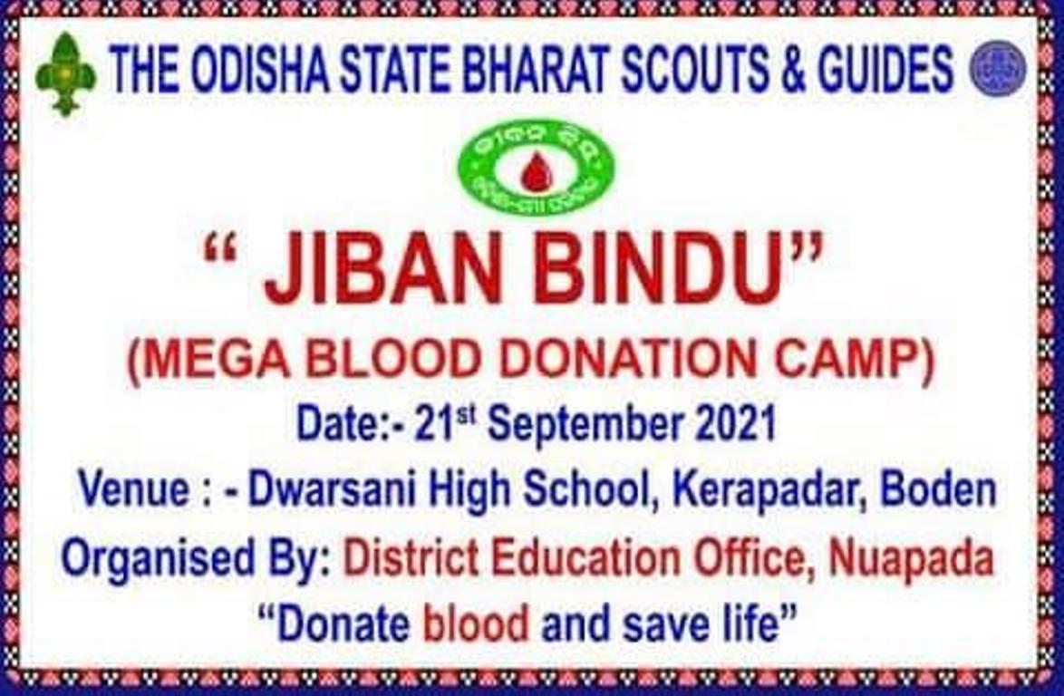 Keeping the necessity of blood in view , A mega blood donation camp was organised at. Nuapada by Odisha state Bharat Scouts & guides in collaboration with "Jeevan Bindoo" on 21st September of 2021. The camp was organised in the premises of Dwarsani High School, Kerapadar, Boden, Nuapada