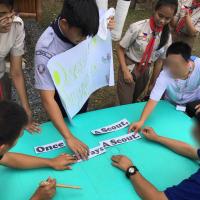 After the Opening Ceremony at 8:15 AM, the Scouts have immediately started their lesson. The assigned Scouts for the day taught the children all about the Scout Oath and Law, Scout Motto and Slogan. They have prepared visuals and have taught them how to properly recite it, telling them the proper stance and proper way to execute the Scout Sign. Shortly after this, they have started to do the activities they have prepared. The first activity they have prepared started at 9:15 AM and has ended on 9:45 AM. Each was given a word, and will fill-in the blank with the missing word from the Scout Oath. With just the first activity, everybody was already excited. The next activity began immediately after this, ending at 10:30 AM. The children were set off to find flash cards, containing each part of the Scout Law. They will enact the specific part of the Scout Law they have gotten in front of their peers.
