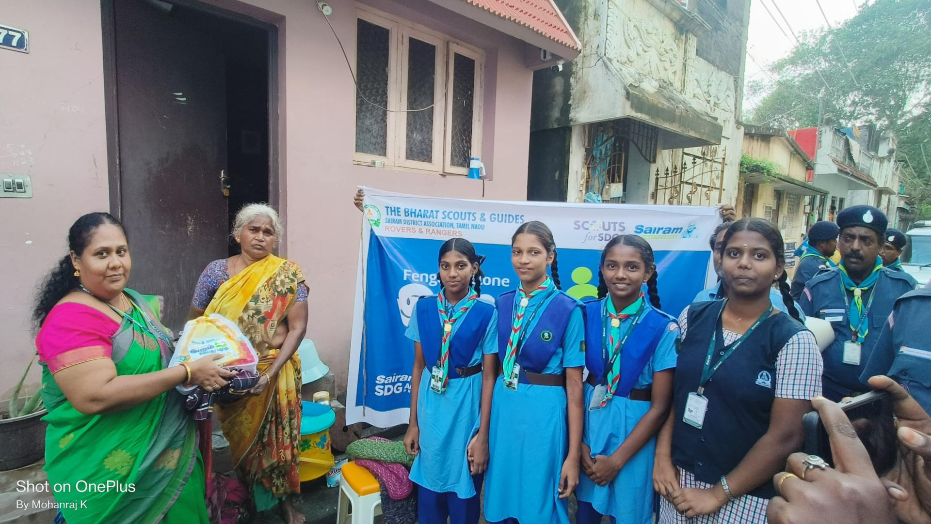 In response to the dreadful Fenjal Cyclone, we mobilized 43 members from Rovers and Rangers teams for flood-relief activities in the villages Koodapakkam, Kanavapettai, and Villiyanur, Puducherry. Under the "Flood Relief Distribution Drive: Together, We Can" initiative, we distributed as many as 500 ready-to-use essential supply packs to the families in trouble. These essentials will create hope in their minds of survival and can bring those people out of misery for a while.
