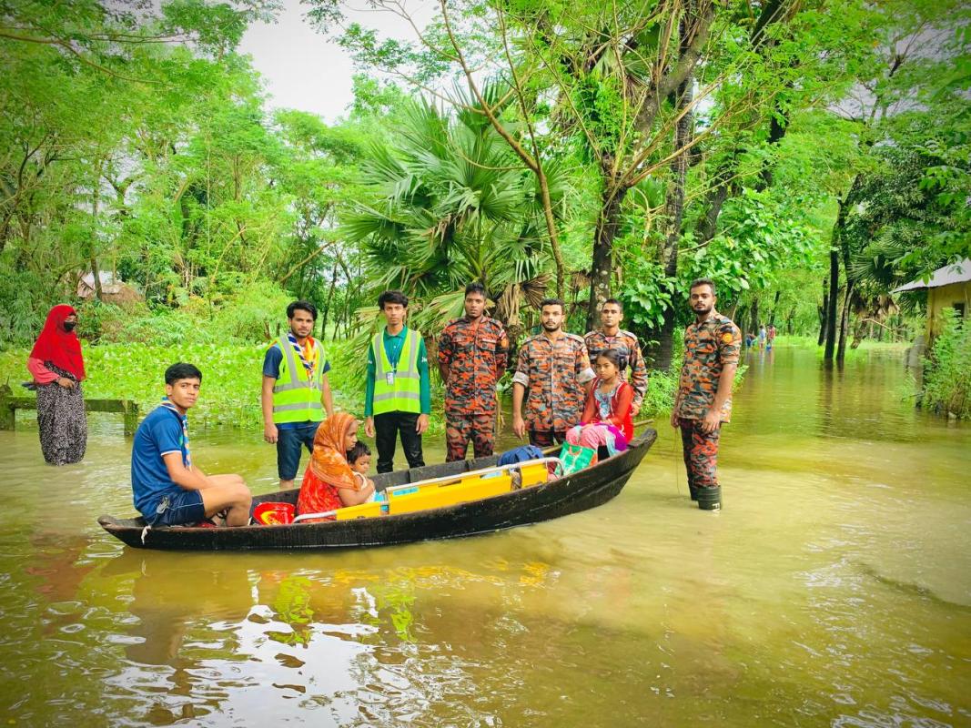 To implement the flood relief project in Noakhali region, 20 Rover Scouts of Kabir Hat Government College Rover Scout Group first assessed the affected areas. When we reached a 10 km wide area where a homeless pregnant woman and child were stranded, we went out to rescue them along with my Rover Scouts and fire service personnel. After crossing a long 10 km road, we were able to rescue them. Then, we brought them to Kabir Hat Government College shelter by boat.