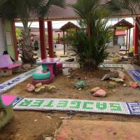 Kami membersihkan penutup botol yang di tanam menggunakan air dan mop , Kemudian kami menghias taman dengan mengecat kerusi dan Meja