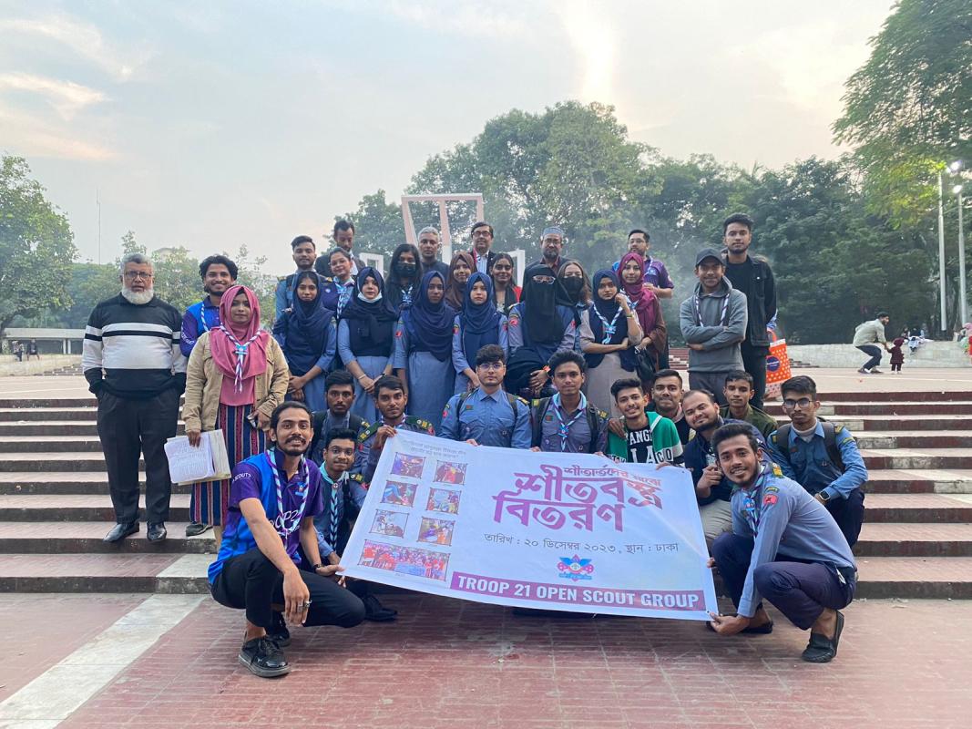 গত ২০/১২/২০২৩ ইং রোজ শুক্রবার বেলা ৪:০০ মিনিটে গ্রুপ ২১ মুক্ত স্কাউট গ্রুপের পক্ষ থেকে ৫০ জন স্কাউট, রোভার ও লিডার বৃন্দদের নেতৃত্বে ১০০ জন পথশিশু ও অসহায় মানুষদেরকে কেন্দ্রীয় শহীদ মিনার প্রাঙ্গনে কম্বল ও শীতবস্ত্র বিতরণ করা হয়৷
