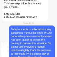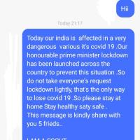 I made 5 + Phone calls and sms to my friends to inform about Covid 19 , various modes of transmission and how to take preventive measures to combat its spread , the steps taken by the Govt. of India to contain the pandemic with the 21 days lockdown and urge them to call 5 of their contacts and do the same and keep the chain going on…..