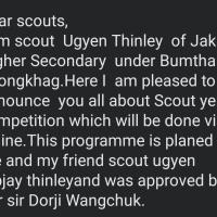 This program was planned by me and my friend ugyen thinley and was approved by Dorji Wangchuk sir.Scout Yell competition was held via online.