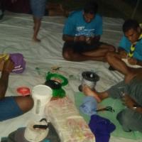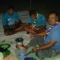 THE DISTRICT COMMISSIONER SHARES THE KNOWLEDGE OF KNOTTING WITH THE LEADERS OF FIJI SCOUTS.