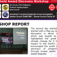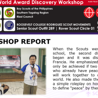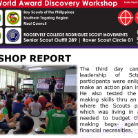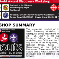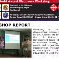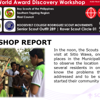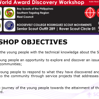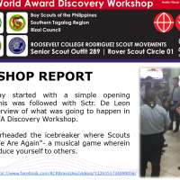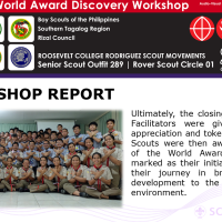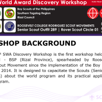 The aforementioned SWA Discovery Workshop was spearheaded by Sctr. Bernando G. De Leon, Deputy National Program Commissioner for Community Based-Scouting, together with his team- Sctr. Dexter C. Villa, from the Department of Environment and Natural Resources; Sctr. Carmelo B. Francia, the Program Research Development Officer of the Boy Scouts of the Philippines-National Office; Sctr. Roy Christian A. Inciong, from Globe Telecom; and, Sct. Allizandra Janina F. Gulapa and Sct. Carl Jeff Andrew F. Angeles, both from Brighton Venturers 1012 of Manila Council.