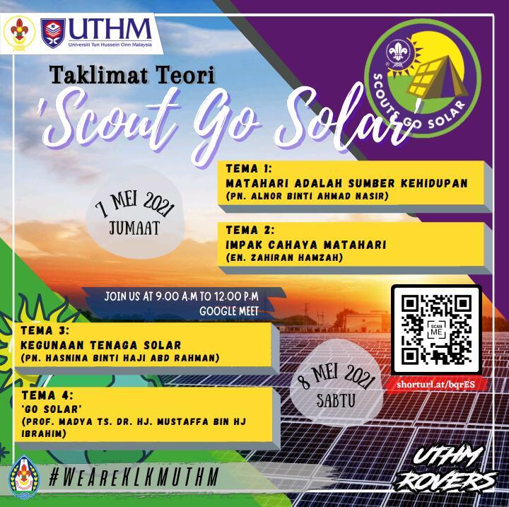 Pada 7 & 8 Mei 2021 yang lalu, KLKM UTHM telah mengadakan program Taklimat Teori "Scouts Go Solar" yang berlangsung di platform Google Meet bermula pada pukul 8.45 am sehingga 12.00 pm. Tujuan program ini dijalankan adalah bagi memberikan pendedahan dan kemahiran kepada setiap ahli KLKM UTHM untuk menjalani kehidupan dengan menggunakan tenaga yang diperbaharui daripada sumber matahari iaitu tenaga solar.