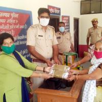थानेदार चंद्रवीर सिंह भाटी थाना गुड़ा एंदला को खाकी मास्क सुपुर्द करते हुए यूनिट लीडर सुमन चारण