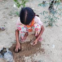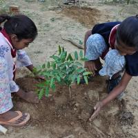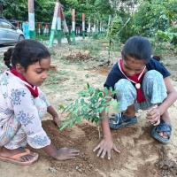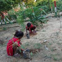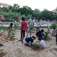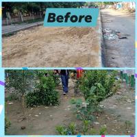 Last year we selected a green belt for planting trees. And we all planted around 100 trees there. Today that green belt has turned green and the trees have grown. Today once again we planted trees on the empty space on the green belt and other empty spaces nearby. The trees that all the children had planted last year have now grown. All the children were very happy to see their trees grow, flowers had also bloomed in some of the trees.