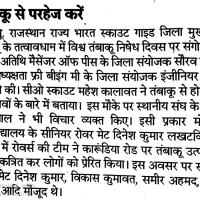 राजस्थान राज्य भारत स्काउट गाइड जिला मुख्यालय झुंझुनू के तत्वावधान में विश्व तंबाकू निषेध दिवस के अवसर पर संगोष्ठी का आयोजन मैसेंजर ऑफ पीस के जिला संयोजक सौरव केडिया के मुख्य आतिथ्य एव फ्री बीइंग मी के जिला संयोजक इंजीनियर विजय गर्वा की अध्यक्षता में स्काउट कार्यालय परिसर में आयोजित किया । इस अवसर पर सीओ स्काउट महेश कालावत ने संबोधित करते हुए कहा कि तंबाकू एवं नशा मानव शरीर के लिए नाश की जड़ है जिससे विभिन्न प्रकार के कैंसर जैसी भयानक बीमारियां उत्पन्न हो जाती है कलावत ने कहा कि आपका जीवन सिर्फ आपका ही नहीं आपके अपनों का भी है इसलिए तंबाकू खाना छोड़ें और जीवन से नाता जोड़े इस अवसर पर स्काउट गाइड द्वारा नशा नहीं करने के लिए प्रतिज्ञा ली तथा तंबाकू एवं गुटखा के पाउच एकत्रित कर उनको जलाया तथा इसी अवसर पर स्काउट गाइड कार्यकर्ताओं द्वारा एक हस्ताक्षर अभियान के तहत सभी ने विश्व तंबाकू निषेध दिवस के बैनर पर अपने हस्ताक्षर कर मानव जीवन को नशे की लत से दूर करने के लिए अपना योगदान दिया ।।