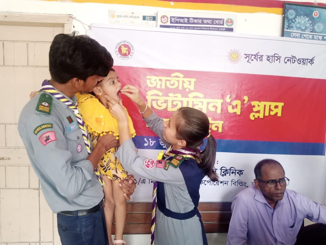 On 18 June 2023, National Vitamin "A" Plus Campaign was conducted throughout the country. We worked at Mirpur-13 under Dhaka North City Corporation, Dhaka-1216 with Surjer Hasi Clinic. We voluntarily worked for eight hours from 8 AM to 4 PM. We worked at three venues. And provided capsules to more than 1200 children aged of 6 months to 59 months.