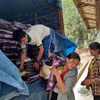 volunteers in unloading of food commodities FCB at Wangdue PS with other scout leader.