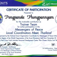 ผมปฏิบัติหน้าที่เป็นคณะวิทยากรฝึกอบรมหลักสูตรผู้นำลูกเสือสันติภาพ รุ่นที่ 3 ของประเทศไทย หรือ Messenger of Peace Thailand ซึ่งเป็นโครงการลูกเสือสันติภาพของสำนักงานลูกเสือโลก สนับสนุนโดยสำนักงานสำนักงานลูกเสือโลกภาคพื้นเอเซีย-แปซิฟิก ดำเนินงานโดยสโมสรลูกเสือราชาธิวาส โดยมี ดร.ณัฐวัฒน์ นิปปกากร เป็นผู้อำนวยการฝึกอบรม ...ขอกราบขอบพระคุณท่านผู้ใหญ่ใจดีทุกท่าน ที่ได้กรุณาให้โอกาสอันดียิ่งแก่กระผม ให้ได้ร่วมงานสำคัญของสำนักงานลูกเสือโลก ในครั้งนี้ครับ