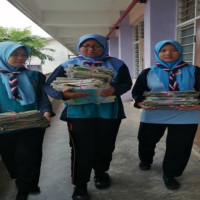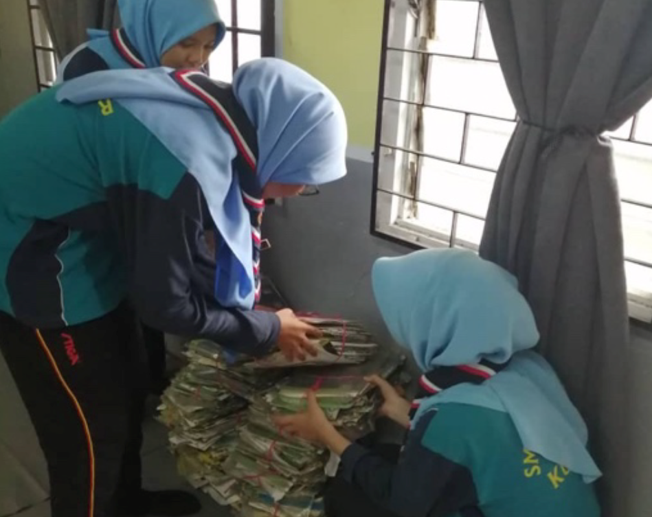 Pelajar SMK Paya Besar turut membantu dengan membawa barangan kitar semula dari rumah masing-masing seperti surat khabar lama, botol-botol minuman dan buku-buku tulis lama yang sudah tidak digunakan lagi.