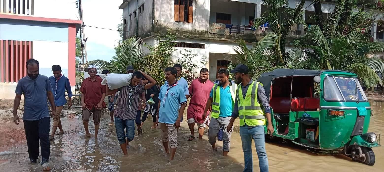 We started this work with the encouragement and inspiration of District Rover Scout Editor Md.Mobosshir Ali sir and the consent of College Principal Sir to help the helpless and hungry people in flood situation.