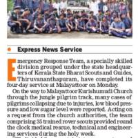 Off the way to Malayatoor Kurishumudi Church through the jungle pilgrim track, there are hundreds of reported cases where the pilgrims collapse down due to injuries, low blood pressure, low glucose level and of various other reasons. Based on the request from the church authorities considering the service of this team for last 6 years, the team was re-grouped again with 35 trained rover scouts from different parts of the state, who have provided round the clock medical rescue, technical and engineering services during the Easter holy week of April 2019.