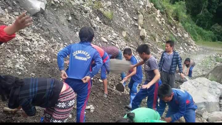 It was done and worked between the Joenkhar community Phongmay gewog for 20 hours. All scouts including teachers and bigger students were involved and we were divided into three teams. Our team worked along the road digging all the mud and threw the stones which had blocked the way.