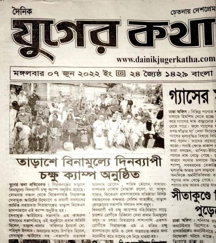 সিরাজগঞ্জের তাড়াশে বিনামুল্যে দিনব্যাপী চক্ষু ক্যাম্প অনুষ্ঠিত হয়েছে। সেবা মুক্ত স্কাউট গ্রুপের উদ্দ্যোগে ও প্রবাসী সদস্যদের আর্থিক সহায়তায় সিরাজগঞ্জের তাড়াশ জিকেএস হাসপাতালে এই ক্যাম্প অনুষ্ঠিত হয়। অনুষ্ঠানে প্রধান অতিথি ছিলেন, তাড়াশ থানার অফিসার ইনচার্জ মো শহিদুল ইসলাম। এই চক্ষু ক্যাম্পের বহি:বিভাগে সাড়ে চারশত রোগীকে চিকিৎসা সেবা প্রদান বিনামুল্যে ওষুধ ও চশমা বিতরণের পাশাপাশি একশত রোগীকে সিরাজগঞ্জ এম এ মতিন চক্ষু হাসপাতালে ছানি ও লেন্স অস্ত্রপ্রচার করার জন্য মনোনীত করে তাদের কে নিয়ে যাওয়া হয়।