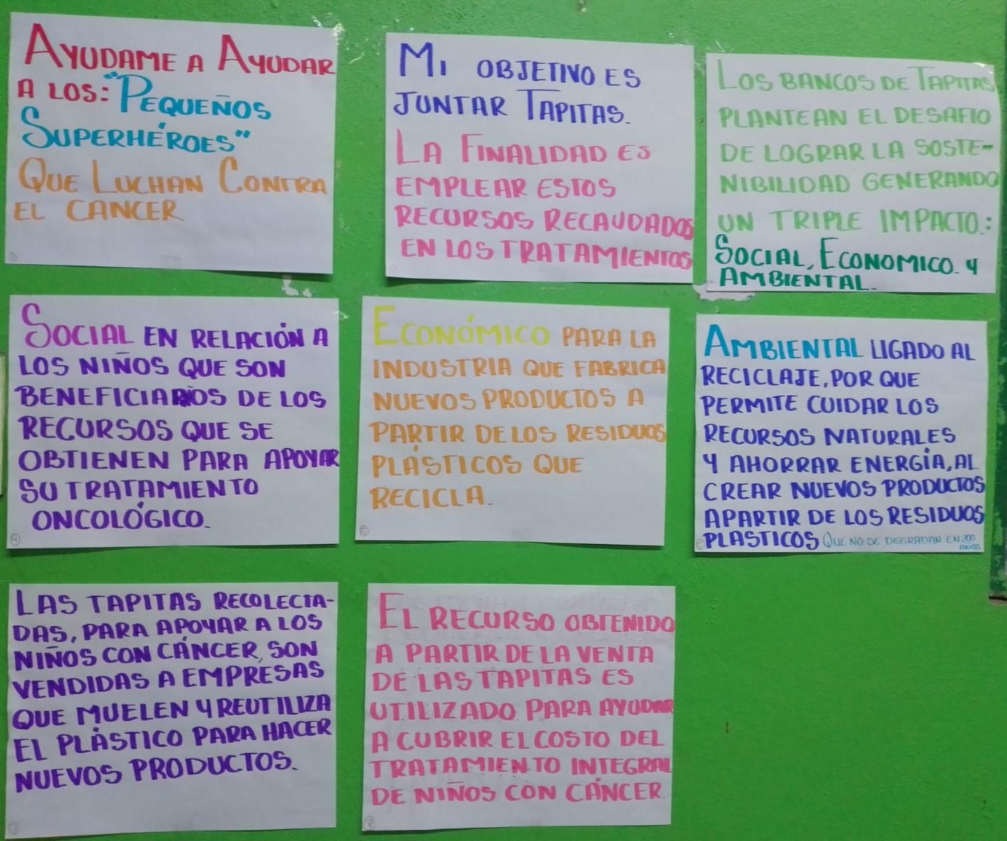 Buscamos información sobre asociaciones civiles dedicadas a apoyar a niños con cáncer como El Banco de Tapitas, A. C, Cuenta con un programa que da atención a menores de 21 años con diagnóstico de cáncer. En Mérida, se cuentan con dos empresas que pertenecen esta asociación y se dedican a recibir las donaciones de las tapas. Decidimos recaudar la mayor cantidad de tapas en un lapso de cinco meses con la participación de amigos, familiares y scouts.
