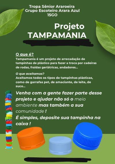 Fiz cartazes, coloquei caixas, conversei com as pessoas da minha escola, igrejas que conheço e amigos para que todos fizessem arrecadações de tampinhas de plástico em suas casas para doar para uma ONG chamada Rotary Club Goiânia, que com o projeto tampamania, vende as tampinhas para centros de reciclagem e com o dinheiro compra cadeiras de rodas.