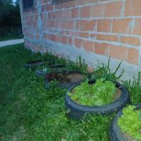 "A primeira coisa que eu e meu irmão fizemos foi pegar os pneus, conseguimos em uma borracharia aqui perto de casa, já cortamos alguns deles e ajeitamos no local. Depois, pegamos serragem, terra e esterco, como ja temos boi, cabra, galinha, pato... temos bastante esterco. As mudinhas peguei em uma agropecuária e plantamos, hoje ja esta crescendo"